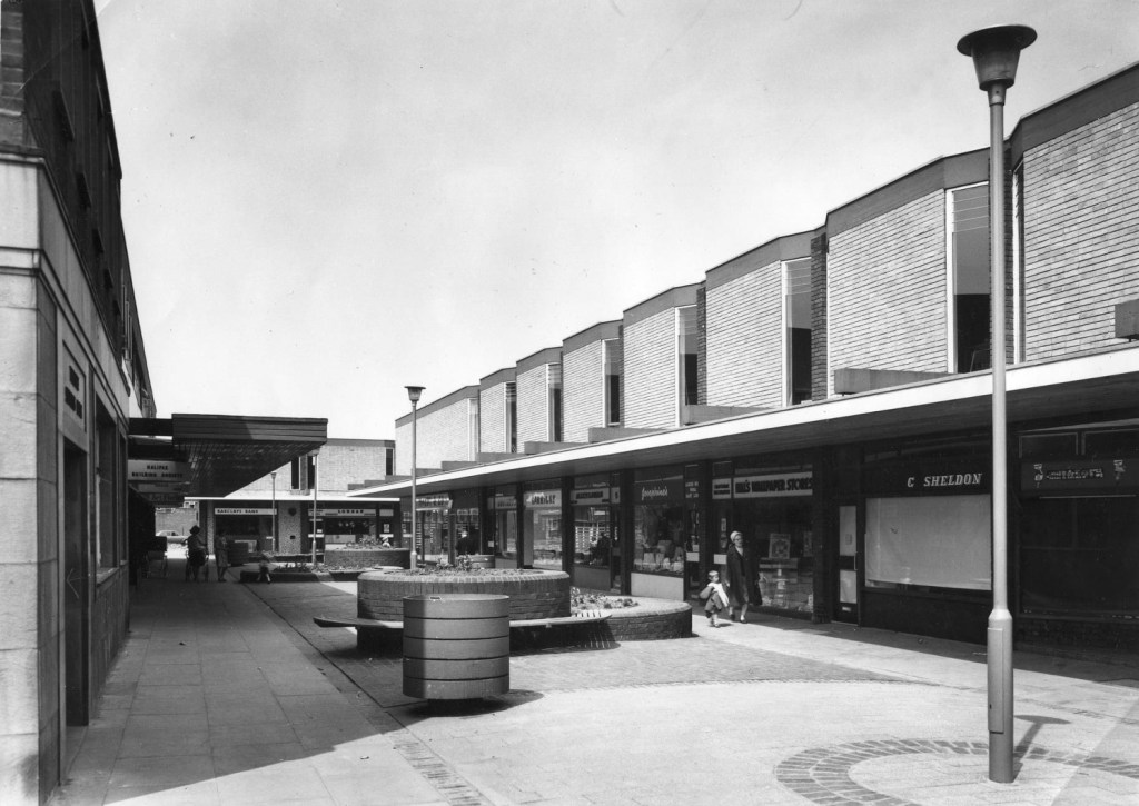 The first nineteen retail units in the shopping centre opened in late 1967, while construction continued on the rest of the centre. This photograph shows Walter Willson’s supermarket open while builders continue to work on the new units.