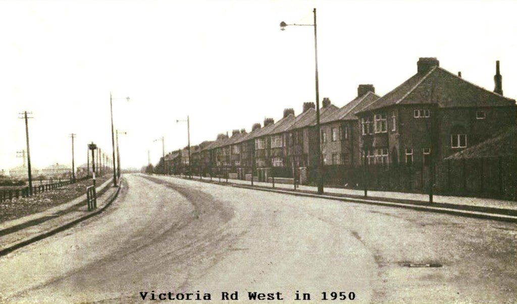 This photograph from 1950 shows the view down Victoria Road West from the Mill Lane junction. You can see the slope of the Reservoir on the right hand side of the foreground. Across the street is a farmer’s corn field:
