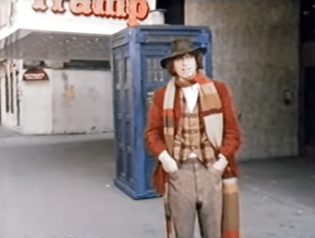 On 25th August, 1975, I watched Tom Baker, in character as The Doctor, sitting in a cinema presenting clips from Disney films in the August Bank Holiday edition of Disney Time. At the end of the show, a hand was seen passing him a note. He read the note and announced “It’s from the Brigadier. He’s in trouble again!” Exiting the cinema, he bid goodbye to the audience and promised that he would see us again soon – “next Saturday in fact” – before dematerialising in the TARDIS.