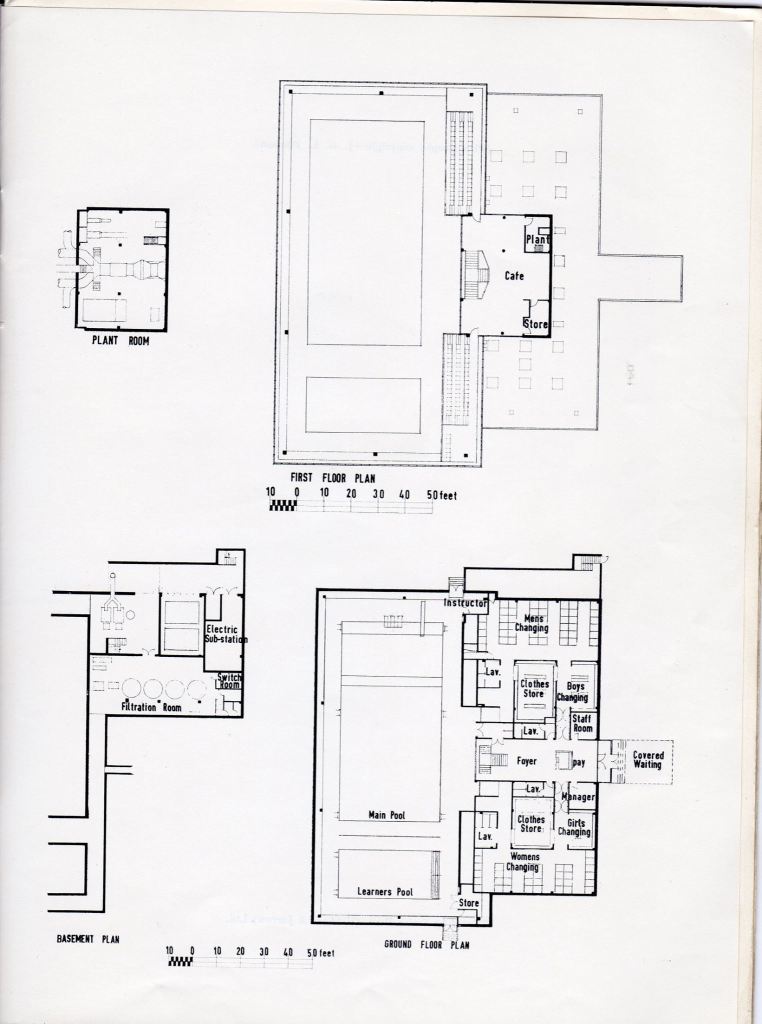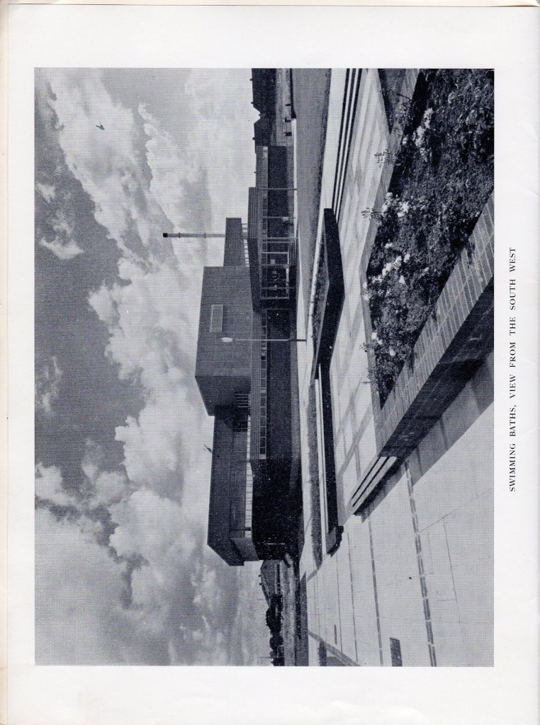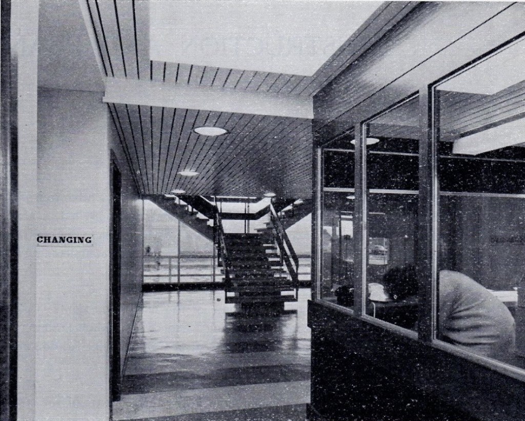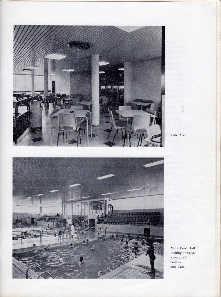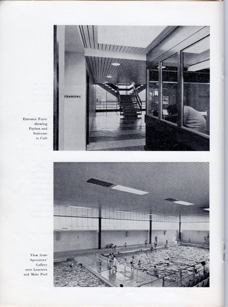 When you went into the baths’ entrance, there was a kiosk where you could pay either to swim or to spectate. “One and a half to swim and one to watch” would be my mam’s usual request to the person in the kiosk, so that Sid and I could go into the pool and she could sit in the viewing gallery to one side of the pools. The photograph below, from the official opening program, shows the entrance to the baths. You can see the pay kiosk to the right hand side, the entrance to one of the changing rooms (I think it is the women’s) on the left and the stairs up to the viewing gallery and cafe in the background. The main pool is visible through the full-length windows in the background.