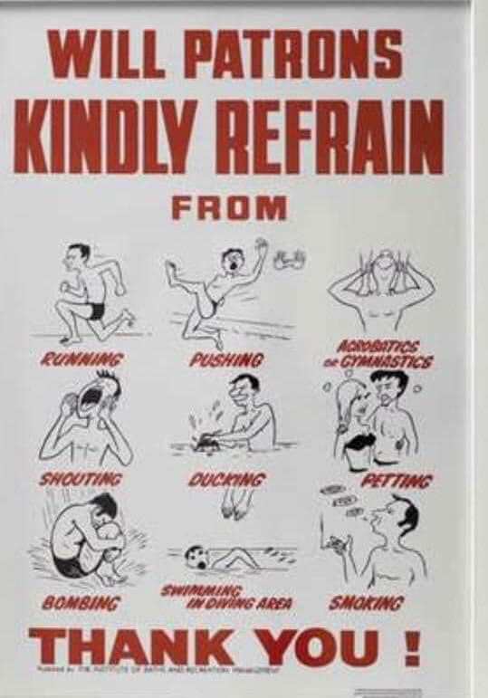 I would continue to visit the baths throughout my youth, though less frequently as I grew older. I remember the sign that was displayed on the wall by the main pool, warning patrons of all the things that they should not be doing at the baths: