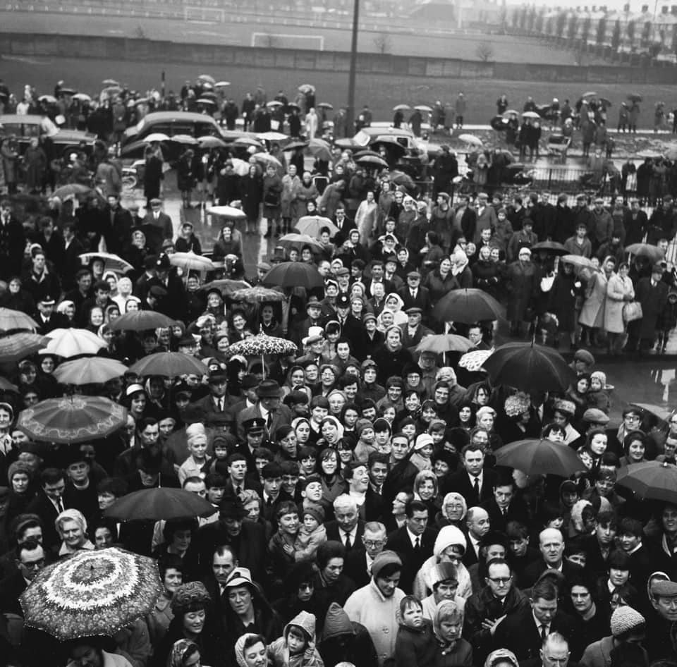This photograph shows people watching the opening ceremony in 1967. Swan Hunter Sports Ground and Victoria Road East are visible in the background as well as Campbell Park Road.