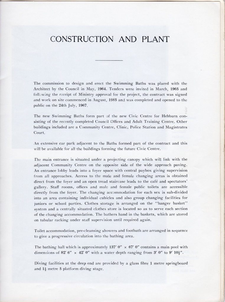 The new facility at Hebburn Central is beautiful, and like the original baths features a learners’ pool, which is also used for aquatic exercise classes, and a main swimming pool. The pools seem to be the same size as the originals. The changing areas are more modern, with coin-operated lockers, though the seating for viewing is limited compared to the original swimming baths.